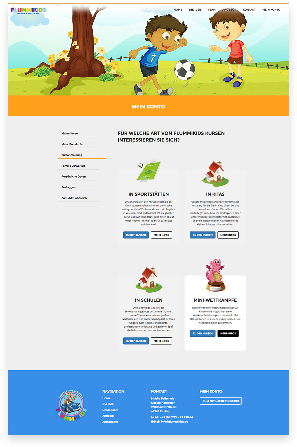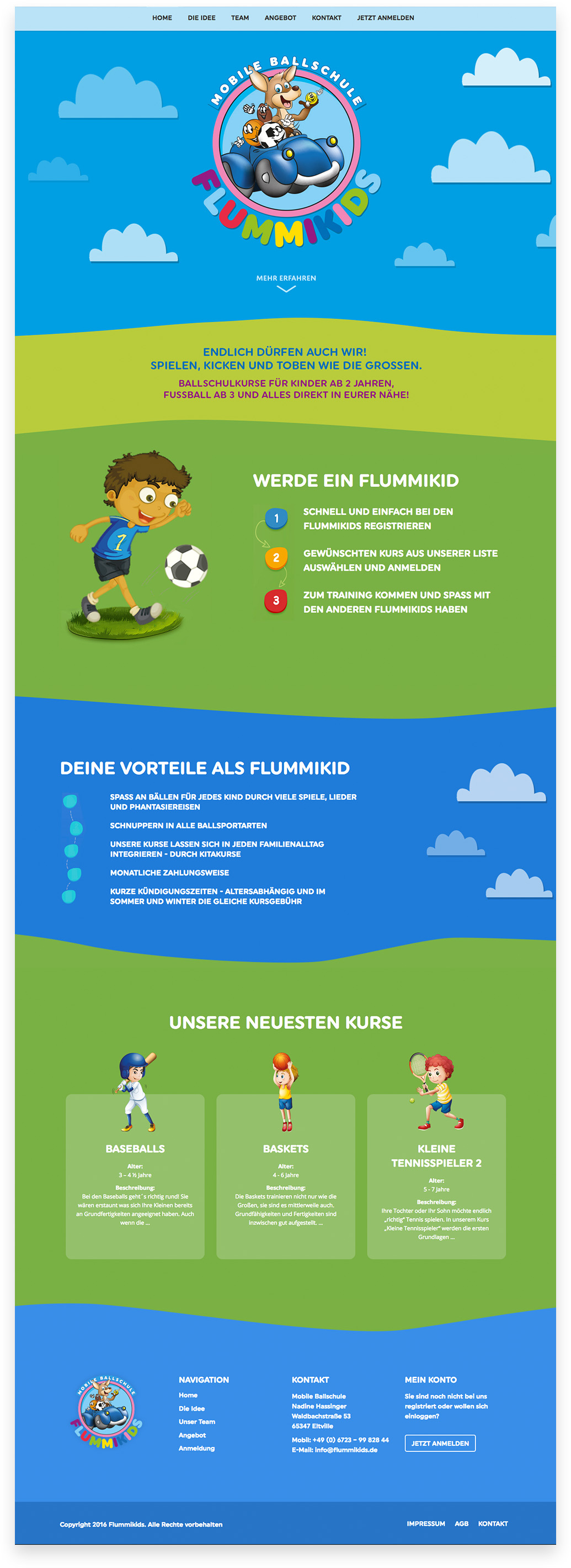 Zur Neugründung der mobilen Ballschule Flummikids musste eine passende Internetpräsenz her. Die Seite sollte vor allem kinderfreundlich und übersichtlich sein und den Spaß am Ballsport vermitteln.